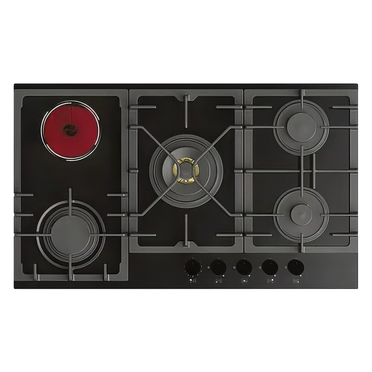 Il piano cottura a gas da 90 cm è estetico e durevole grazie al suo corpo in acciaio inossidabile e alla finitura in acciaio inossidabile. Dotato di 4 fuochi a gas e 1 unità di cottura elettrica in pietra, questo piano cottura offre un utilizzo comodo e sicuro con funzioni di accensione automatica e controllo del gas