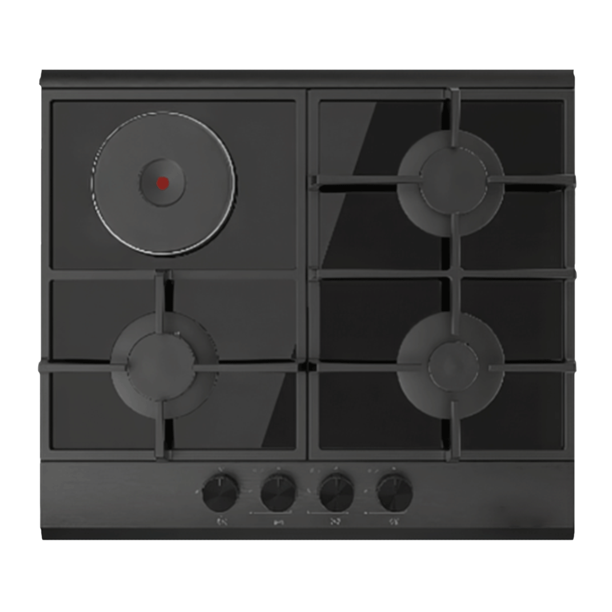 Questo piano cottura a gas con corpo in acciaio inossidabile nero e pannello in vetro è ideale per preparare una varietà di pasti con tre punti cottura a gas e una sezione di cottura elettrica.