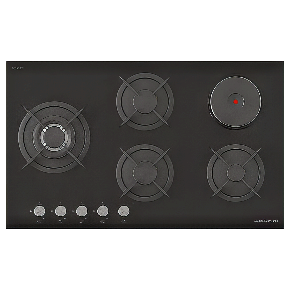 Il piano cottura a gas con corpo in acciaio inox ha un aspetto elegante con vernice opaca smaltata nera. Dotato di 5 fuochi a gas e 1 unità di cottura elettrica in pietra, questo fornello offre un utilizzo sicuro e conveniente con funzioni di accensione automatica e controllo del gas.